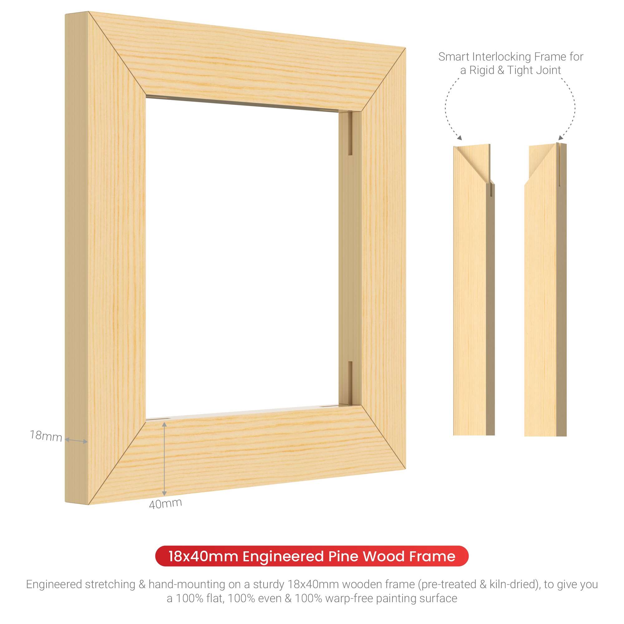 Each Cotton Canvas Stretched is manufactured by engineered mounting of a 100% natural cotton canvas onto a rigid reclaimed wood frame, to give you an absorption-free, warp-free, rigid & flat painting surface, that can be hung directly on a wall or framed once the painting is complete. Our Pre-stretched Canvas with Wooden Frame is available in 10 Oz 440 GSM (Artist Series) fabric, with an option to choose from 18x40mm (Standard) or 35x40mm (Deep Edge) pinewood frames. This allows students, artists, professionals and art studios to choose a pre-stretched canvas that best fits their requirement.