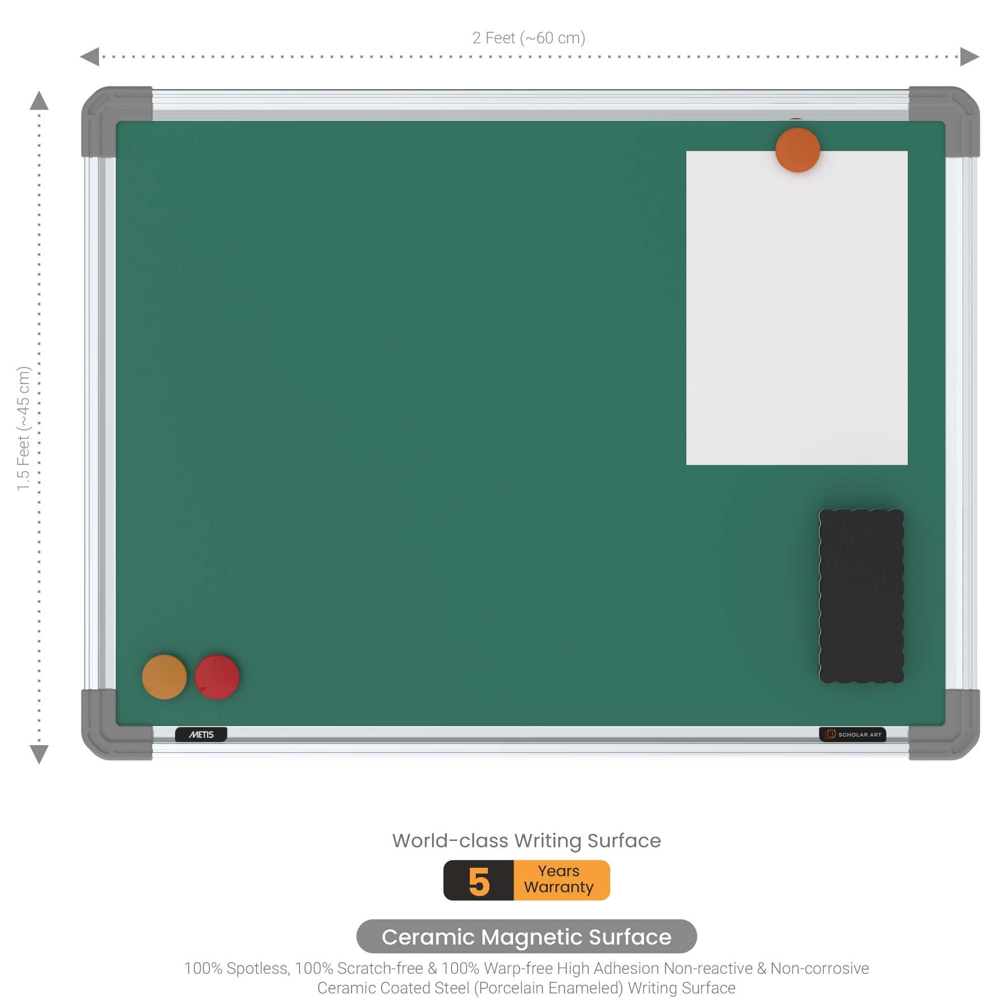 Scholar Art Ceramic Green Chalk Writing Boards or Ceramic Coated Steel Chalkboards are the best-in-class, long-lasting & ultra-premium writing boards that consist of a vitreous or porcelain enameled (ceramic coated steel) surface designed for writing with chalk sticks by Scholar Art. As the name implies, the surface is magnet-friendly i.e. it can be used for applying magnets or magnet-impregnated objects (such as magnetic buttons) for holding accessories like dusters, markers, notes, charts etc.