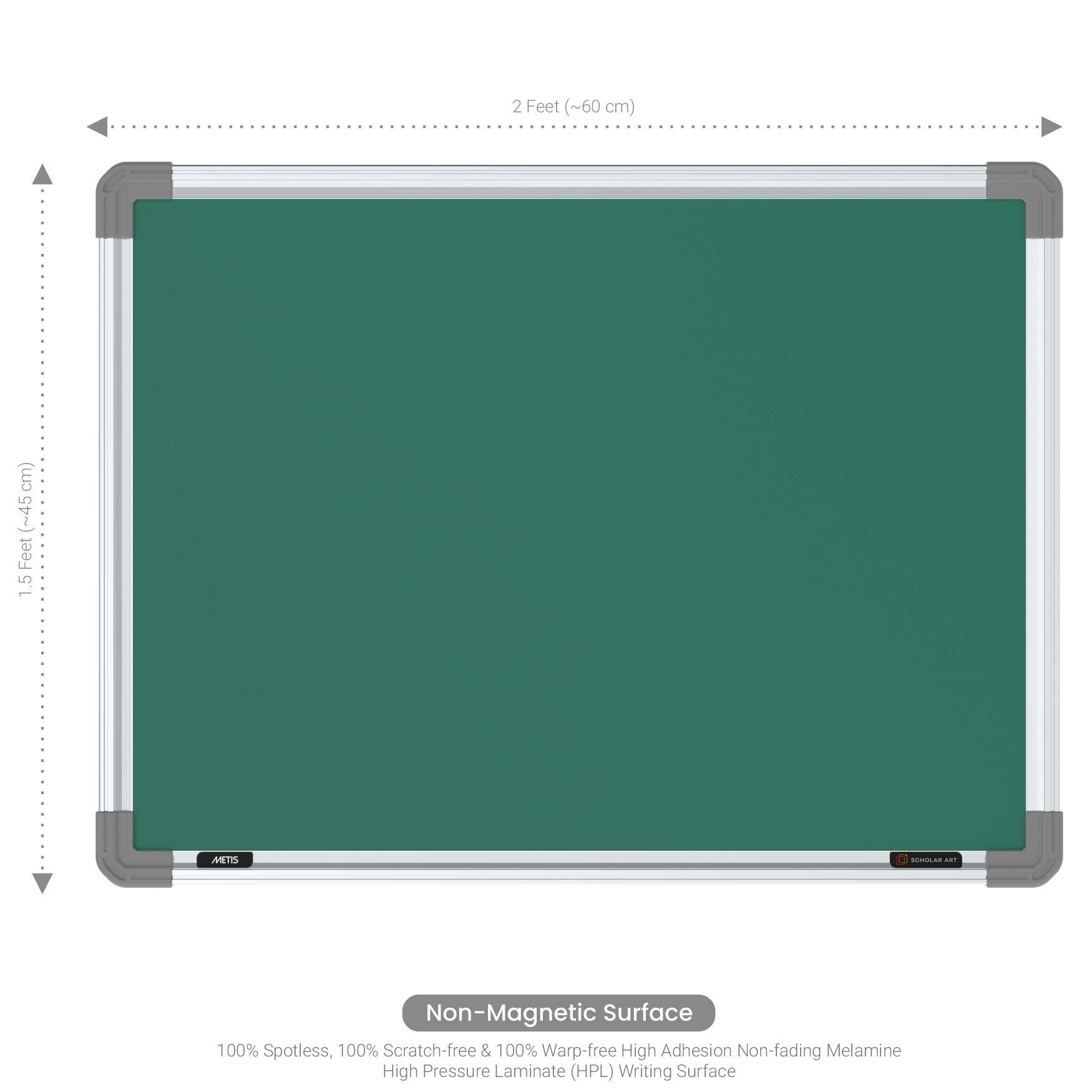 Scholar Art Non-magnetic Chalk Boards or Melamine Chalkboards are premium-quality writing boards that consist of a high-pressure laminate (HPL) writing surface, that is especially designed for writing with chalk by Scholar Art. As the name implies, the surface is not magnet-friendly i.e. it cannot be used for applying magnets or magnet-impregnated objects (such as magnetic buttons) for holding accessories like dusters, markers, notes, charts etc.