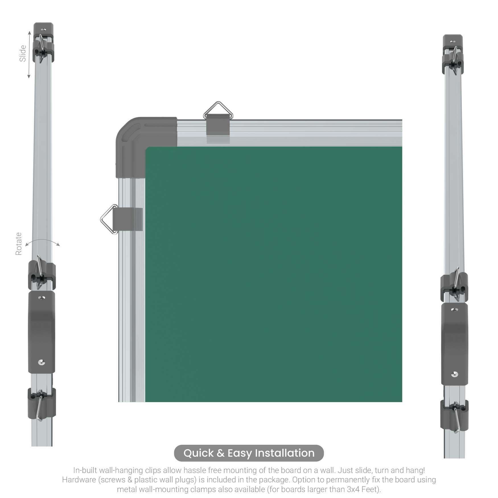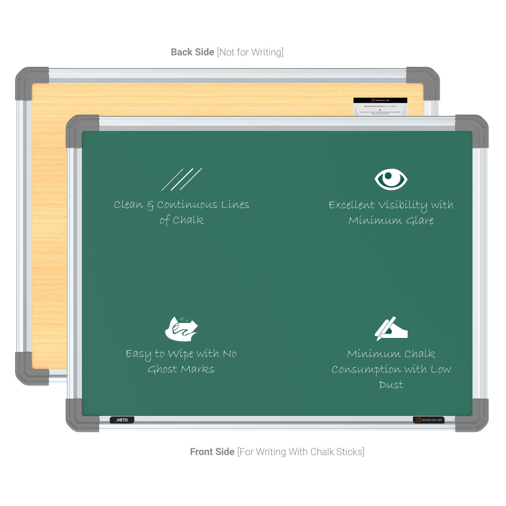The frame is built from alloy aluminium 6063-T6 sections with top-end anodizing, to impart unmatched bending strength and stiffness to the board. The corners are made up of injection-molded virgin ABS for a seamless finish and superior looks. The core is available in the following four options – Thermocol (EPS), Paper Honeycomb (HC), Particle Board (PB) and Fibreboard (MDF) to give you the choice of buying from lightweight (EPS and HC) or heavy-duty (PB and MDF) boards, depending on your need. Through years of experience and precise surface engineering, Scholar Art provides a chalk writing surface that is able to form clean & continuous lines of chalk, with minimum noise and minimum chalk dust formation. Scholar Art Non-magnetic Chalk Boards are extremely robust, sturdy and long-lasting with a non-fading, non-corrosive, weather-proof, termite-proof and low-maintenance surface. Hence, these Chalkboards are ideal for personal or general use at home, office, coaching & school.